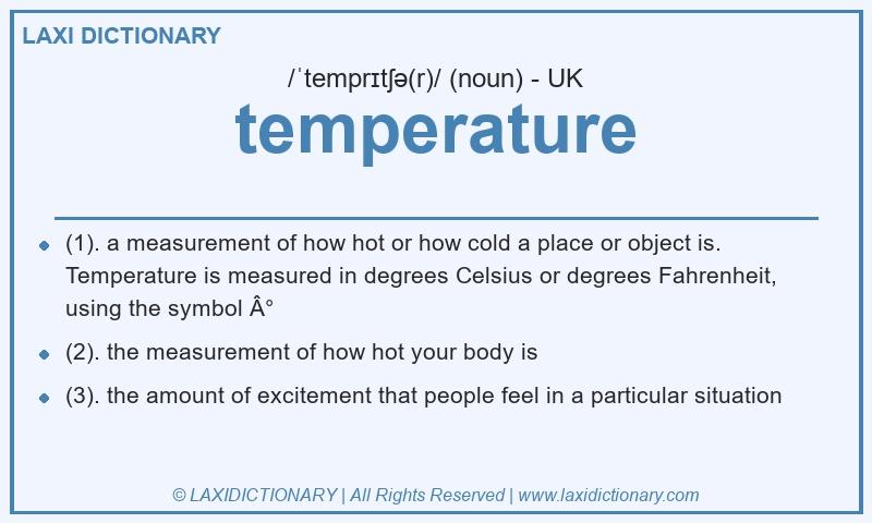 a measurement of how hot or how cold a place or object is. Temperature is measured in degrees Celsius or degrees Fahrenheit, using the symbol °